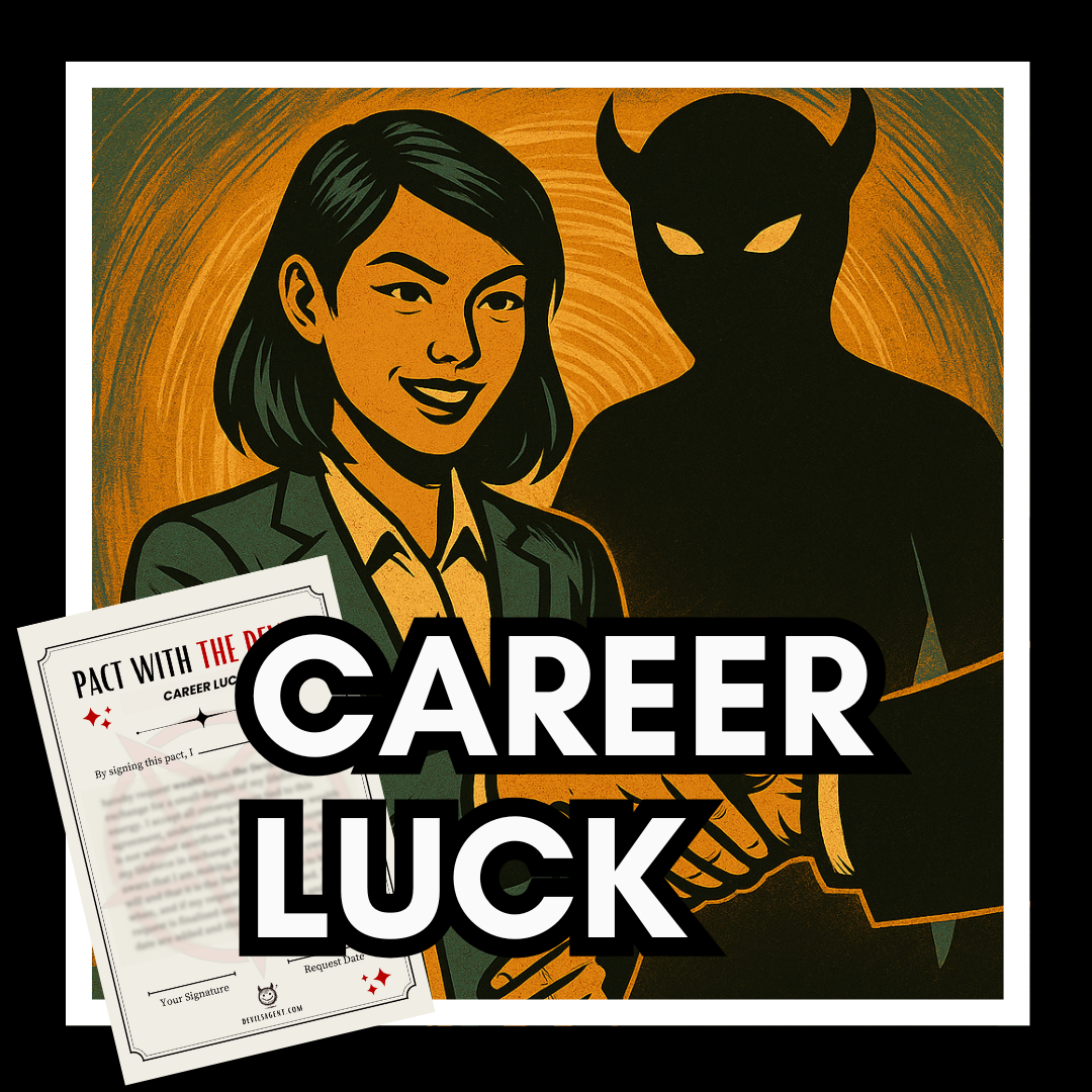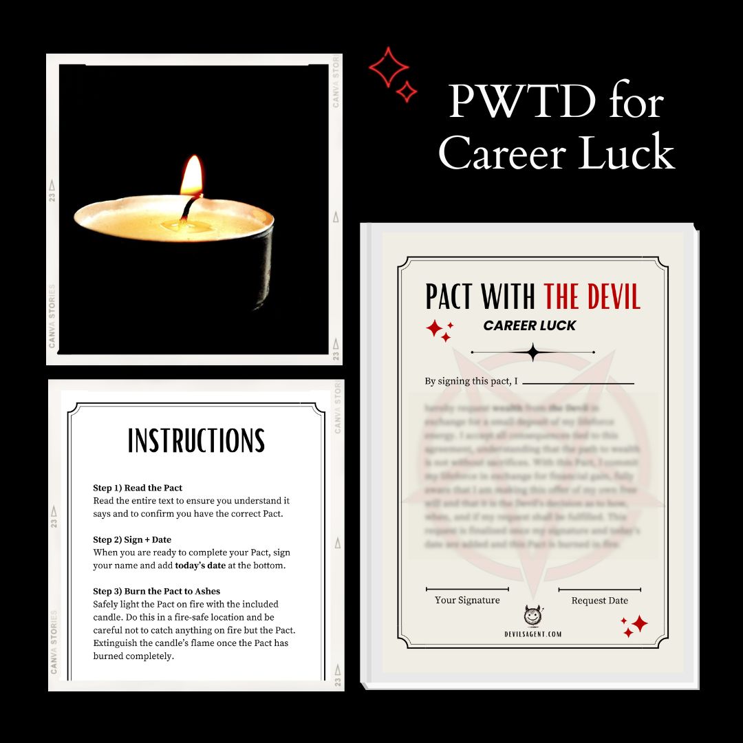 Wish the Devil would help you with your career? Why not ask for it? A Pact with the Devil for Career Luck is your chance to request help from the Devil. Simply fill in the blanks, sign and date, and burn the Pact to complete your request. When you’re ready to ask the Devil to send career luck, order your Pact with the Devil now!